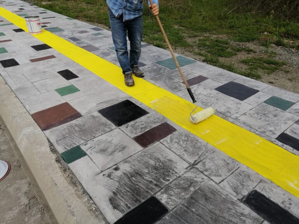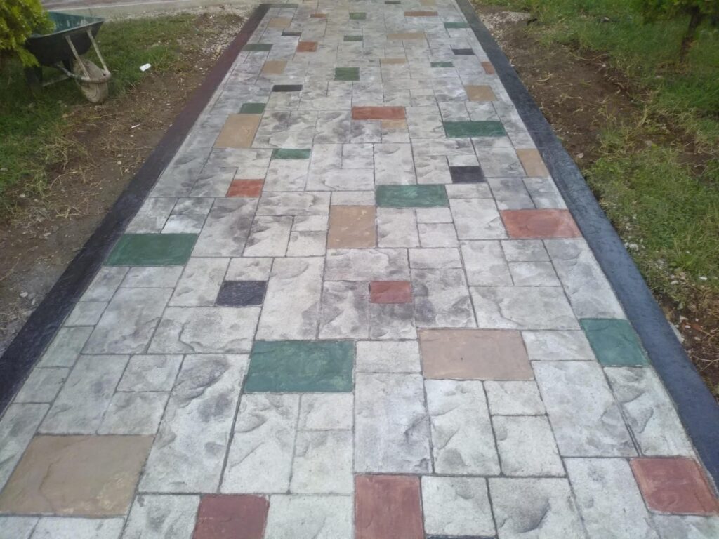 Bu katkı maddeleri belirli bir oranda ilave edilir ve harç aynı zamanda karıştırılır. Beton suyu sızana kadar bekletilir, bu özel baskılı beton aletleri ve malalarla yapılabilir. Hava koşullarına bağlı olarak, betonun dağınık tozu emmesi ve baskı için gereken kauçuk kıvamını alması biraz zaman alacaktır. Ardından, yüzeye ayırıcı ve antik efekt tozunu uygulanır ve seçilen kalıpta plastik kalıp seti kullanılır. Böylece baskılı beton işlemi başarı ile son bulmuş olur.b